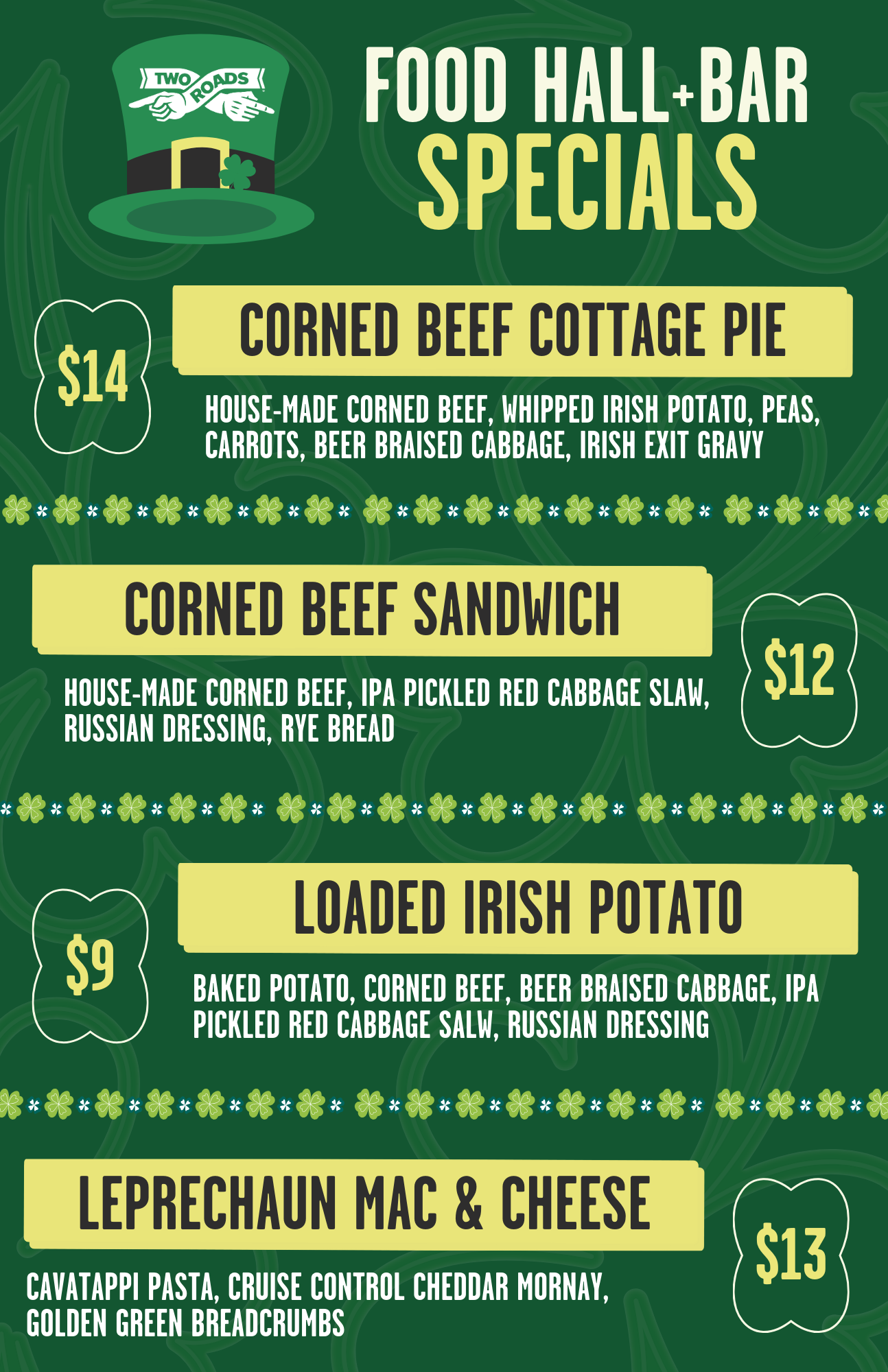 Don’t miss out on this shamrockin’ good time! Grab your friends, throw on some green, and join us at Two Roads for a St. Patrick’s Day celebration like no other!
